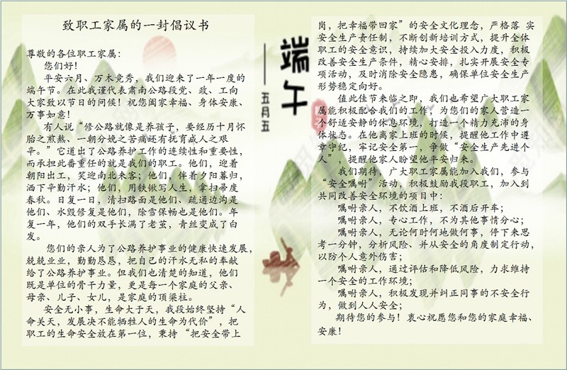 五是开展“亲情寄安”活动。为全段职工家属送上倡仪书,在表达端午节祝福的同时,倡议职工家属提醒亲人提高安全意识,杜绝违章作业,严格执行安全操作规范,保障自身安全。