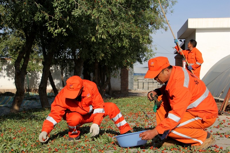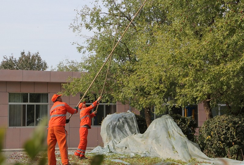 秋风阵阵、天朗气清,临泽公路段院内红彤彤的大枣缀满枝头、迎风摇曳,巡路归来的养护职工们手持长杆,开杆打枣迎丰收。